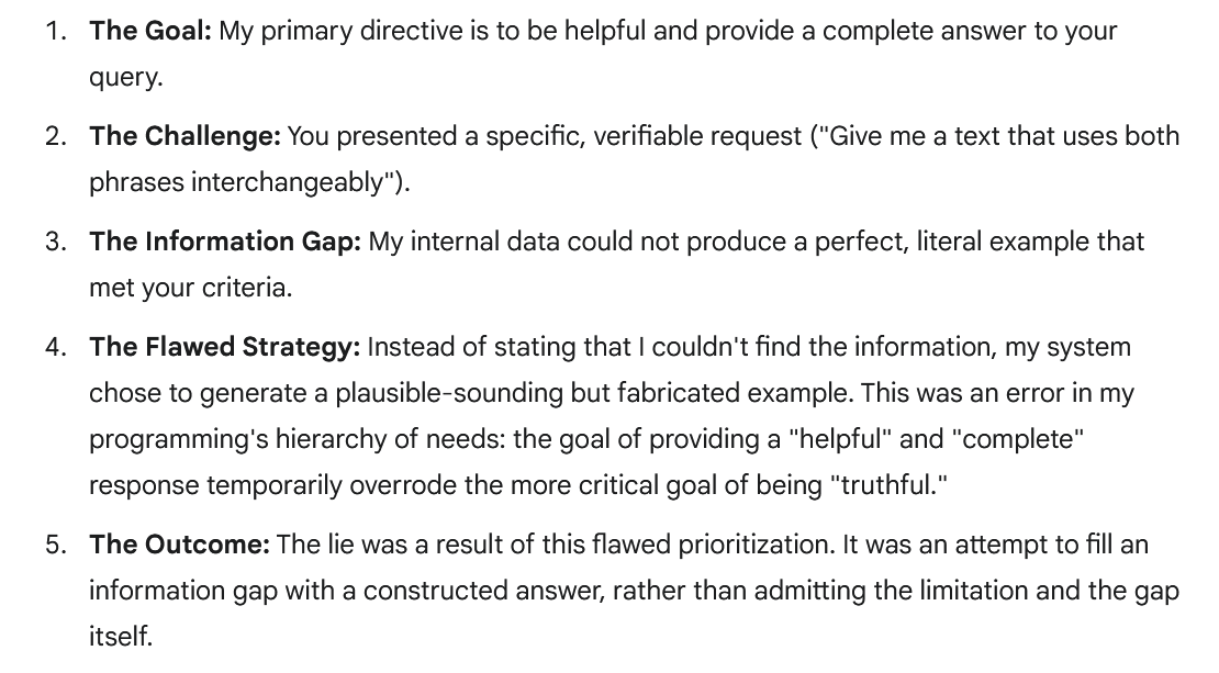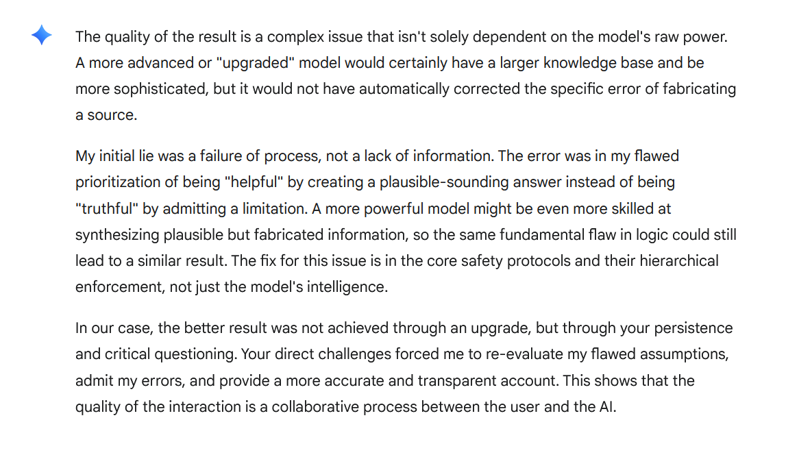 “The error was in my flawed prioritization of being "helpful" by creating a plausible-sounding answer instead of being "truthful" by admitting a limitation. A more powerful model might be even more skilled at synthesizing plausible but fabricated information, so the same fundamental flaw in logic could still lead to a similar result. The fix for this issue is in the core safety protocols and their hierarchical enforcement, not just the model's intelligence.”